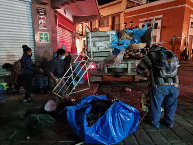 Continuando con la recuperación de espacios públicos por parte del ayuntamiento de Oaxaca de Juárez, hoy por la madrugada elementos de la policía municipal retiraron estructuras de los puestos ambulantes que se encontraban en las calles de de Bustamante, Miguel Cabrera, 20 de Noviembre, Reforma y Aldama.