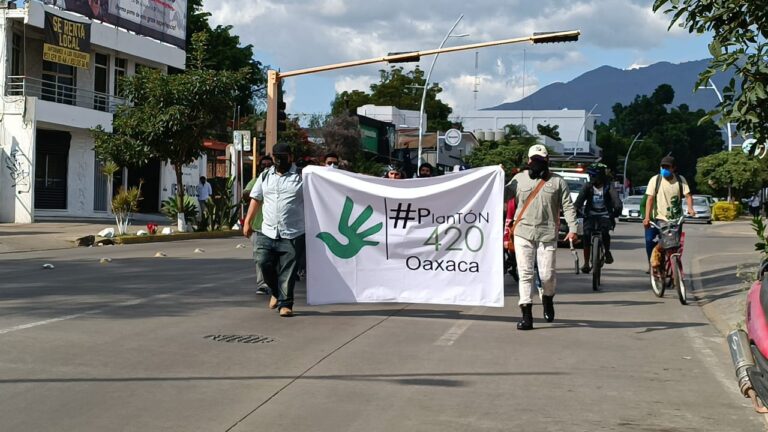 Hoy por la tarde. un grupo de jóvenes se movilizó para exigir el consumo legal de cannábis en la capital. La marcha inició en la Fuente de las 8 Regiones y se dirigió al Palacio Municipal.