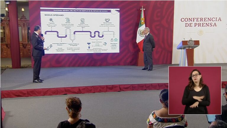 En la sección Cero Impunidad de las conferencia mañanera del presidente, el día de hoy el subsecretario se Seguridad, Ricardo Mejía, explicó el modus operandi de una organización en Oaxaca dedicada al despojo de bienes inmuebles, en colusión con servidores públicos y notarios.El subsecretario indicó que hay 1,467 carpetas de investigación abiertas y 3 magnicidios vinculados.
