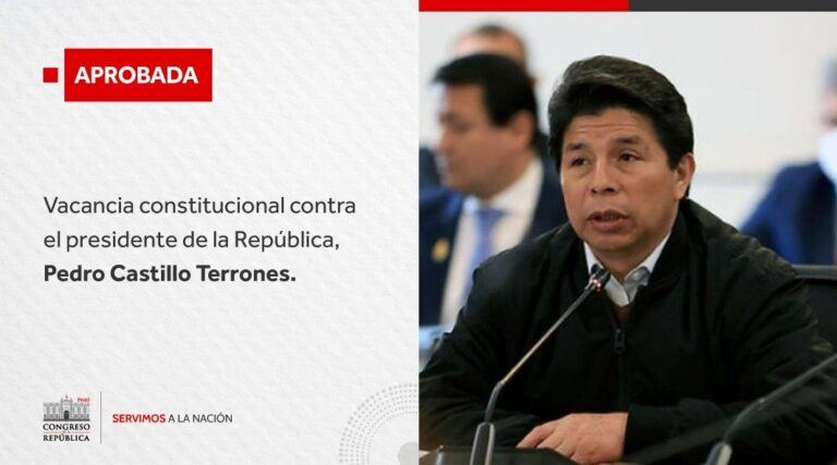 Con 101 votos a favor, seis en contra y 10 abstenciones, el Congreso de Perú, de 130 miembros, declaró incapaz moral a Pedro Castillo y lo destituye como presidente. Hace unos minutos, Castillo había lanzado un mensaje donde disolvía al Congreso y declaraba un gobierno de excepción.