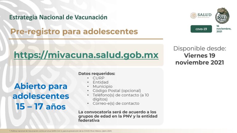 te la conferencia del Presidente Andrés Manuel López Obrador, el Subsecreatario de Salud Hugo López Gatell informó que a partir de este viernes 19 de noviembre se abre el prerregistro para la vacunación contra Covid- 19 a adolescentes de 15 a 17 años que no tienen comorbilidades.