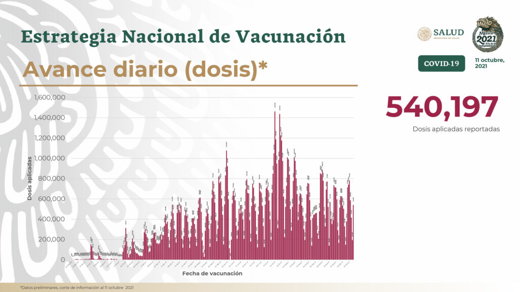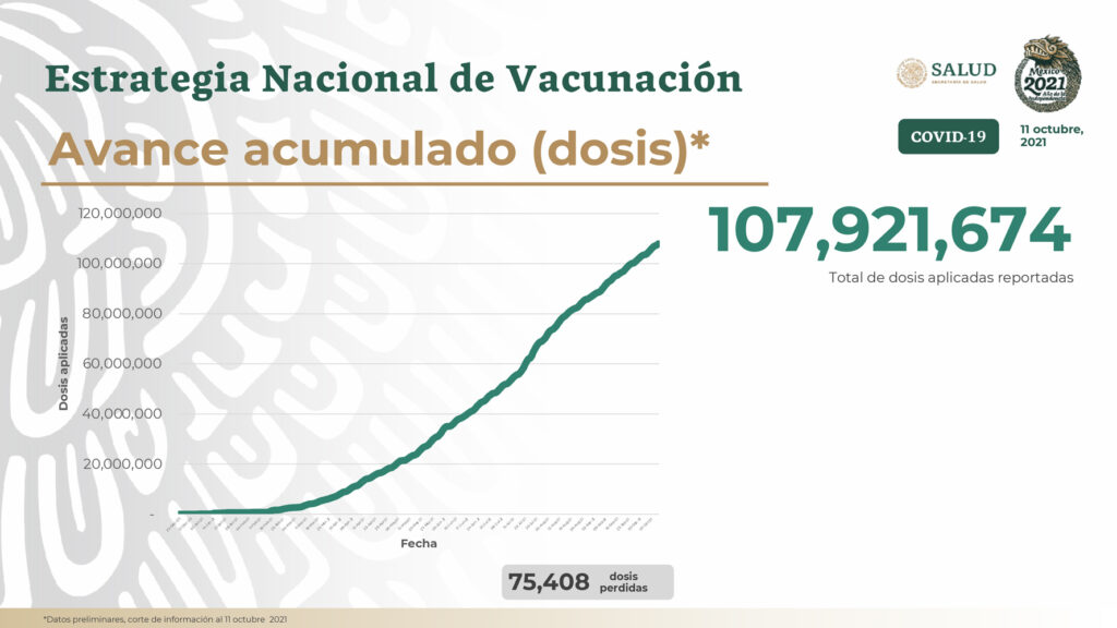 En la conferencia mañanera de hoy, el Subsecretario de Prevención y Promoción de la Salud, Hugo López-Gatell, informó que al 11 de octubre se aplicaron 540 mil 197 dosis de vacunas contra COVID-19. Mencionó que nuestro país suma 107 millones 921 mil 674 dosis suministradas.