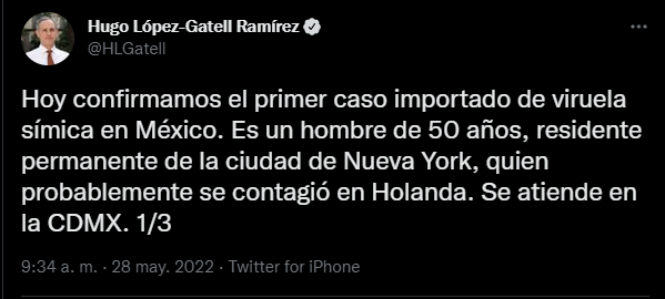 Hoy temprano, el Dr. Hugo López-Gatell, Subsecretario de Prevención y Promoción de la Salud, confirmó el primer caso importado de viruela símica en México. De acuerdo con el funcionario, es un hombre de 50 años, residente permanente de la ciudad de Nueva York, quien probablemente se contagió en Holanda. Se atiende en la CDMX.