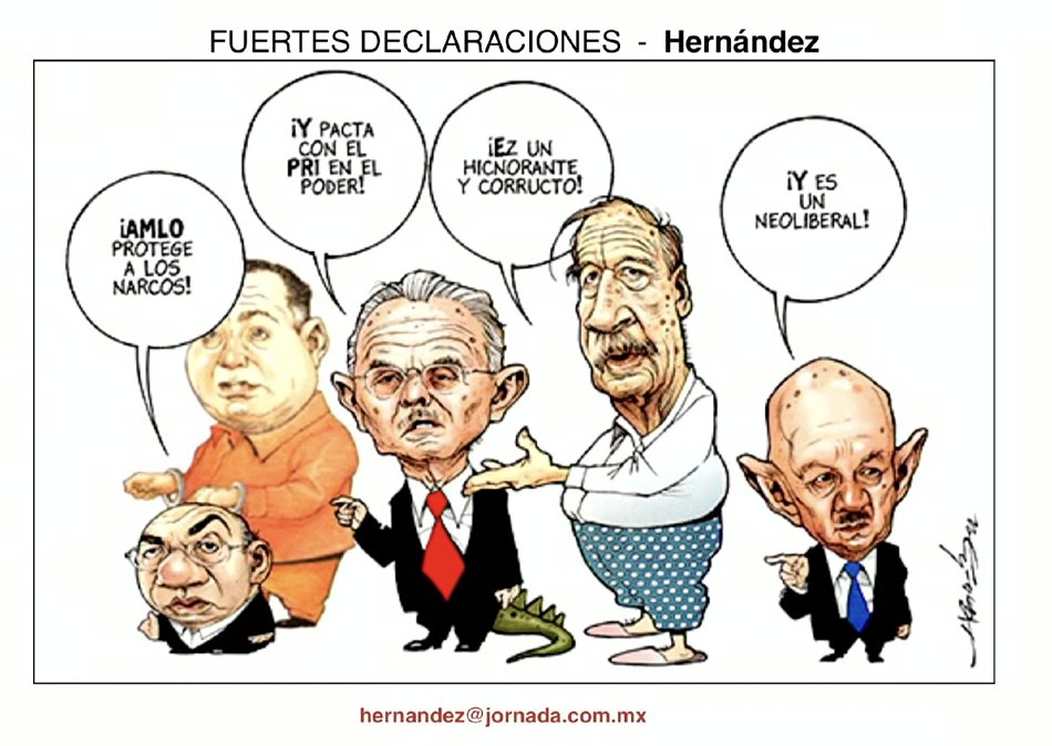 Asimismo, mostró una caricatura del monero Hernández donde se muestran las críticas que le lanzan los expresidentes Calderón, Fox y Salinas y el priísta Labastida, a pesar de que ellos han sido señalados por lo mismo que acusan al presidente.