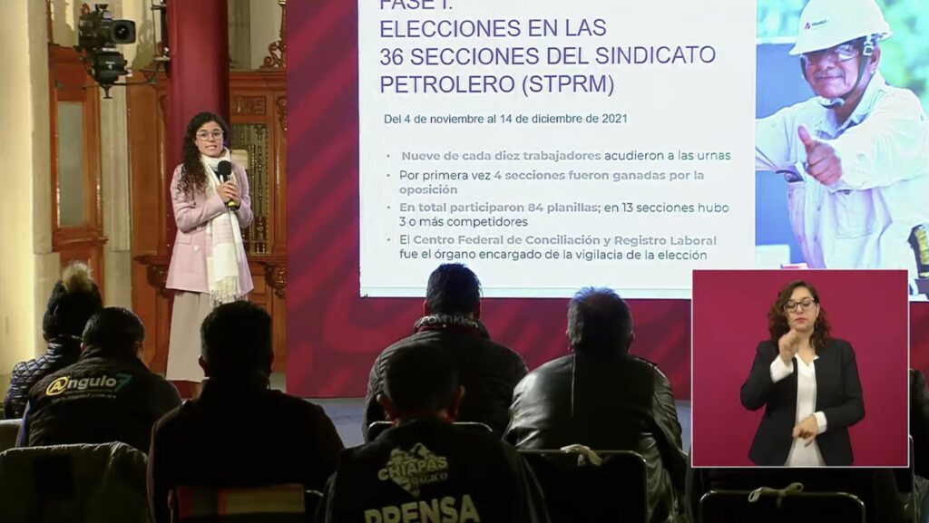 En su intervención, la Secretaria de Trabajo y Previsión Social, Luisa María Alcalde informó que en las próximas elecciones del Sindicato de Pemex será la primera vez que el personal elija a sus dirigentes a través del voto libre, directo y secreto.
