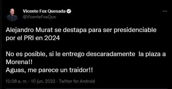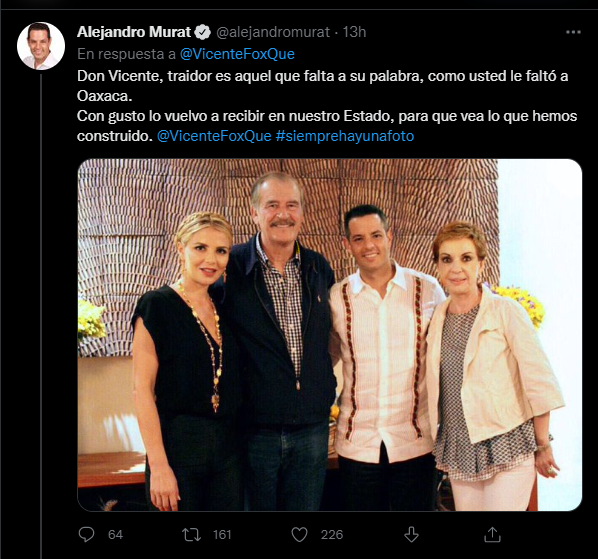 Luego de que el gobernador Alejandro Murat manifestara su interés de competir por la presidencia del país en 2024, Vicente Fox dijo en su redes sociales: «No es posible, si le entrego descaradamente la plaza a Morena,». Como respuesta, Murat le reprochó: «traidor es aquel que falta a su palabra, como usted le faltó a Oaxaca».