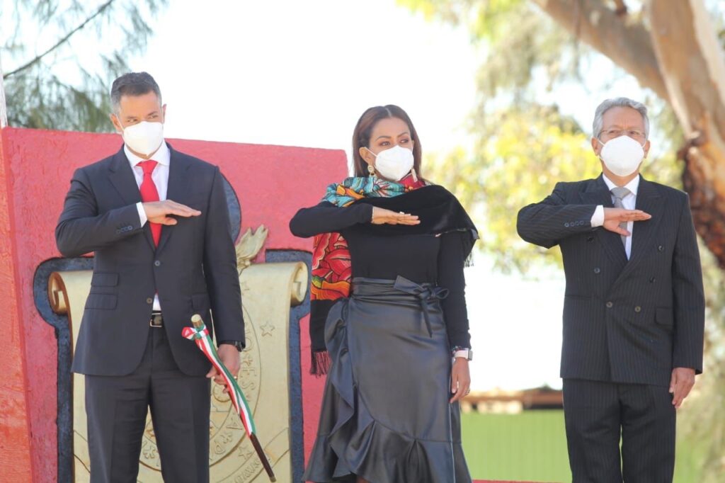 En la ceremonia, organizada por el Gobierno Estatal, acompañó al gobernador, Alejandro Murat Hinojosa y al magistrado, Eduardo Pinacho Sánchez, titular del Tribunal Superior de Justicia de Oaxaca.