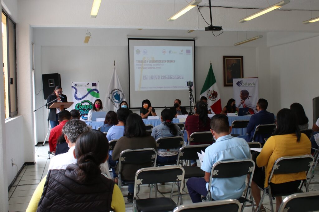 Por su parte, la coordinadora de Valles Centrales de Compás Joven Oaxaca/SiKanda A.C, Estefany Cuevas indicó que, entre los hallazgos del diagnóstico de juventudes en Oaxaca, se pudo identificar la división sexual del trabajo de hombres y mujeres, la dificultad de las juventudes al quedar desempleados durante la pandemia por Covid 19, la diferencia entre los ingresos de trabajos formales e informales, entre otros.