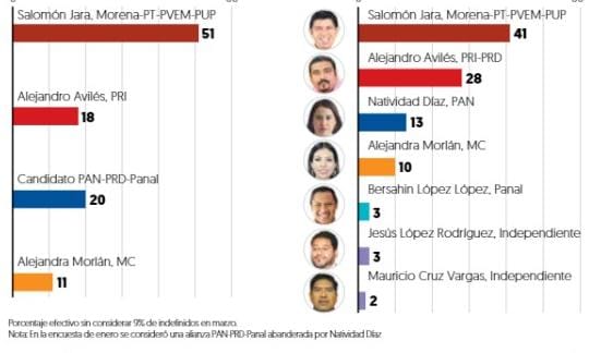 En nuestro estado, las preferencias electorales se han dividido. Salomón Jara cayo 10 puntos porcentuales en comparación con el mes de enero. Avilés creció en el mismo porcentaje. Las candidatas Alejandra Morlán y Natividad Díaz tienen una intención del voto igual o superior al 10 por ciento.