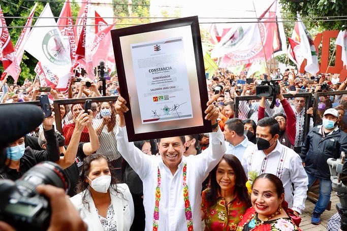 El día de hoy, integrantes del Consejo General del Instituto Estatal Electoral del Estado de Oaxaca (IEEPCO) entregaron la constancia de mayoría a Salomón Jara Cruz como gobernador electo del estado de Oaxaca.