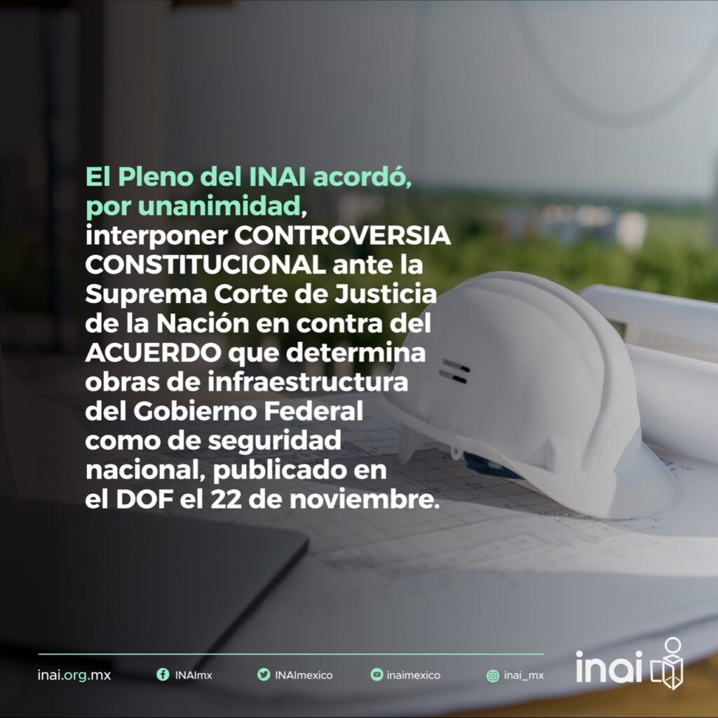 Esta tarde, el pleno del Instituto Nacional de Transparencia, Acceso a la Información y Protección de Datos Personales (INAI) acordó, por unanimidad, interponer Controversia Constitucional ante la Suprema Corte de Justicia de la Nación (SCJN) en contra del Acuerdo que determina obras de infraestructura del Gobierno Federal como seguridad nacional, publicado en el Diario Oficial de la Federación (DOF) el 22 de noviembre.